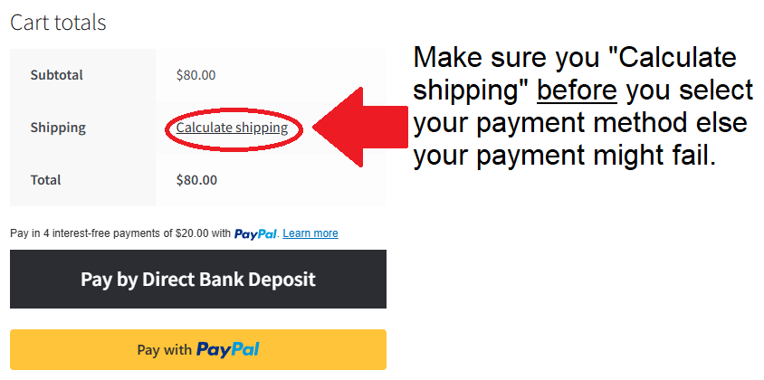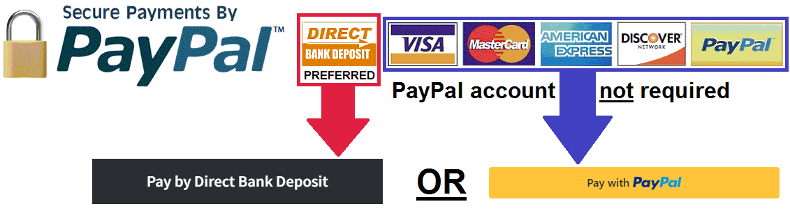 The following payment options are available, with Direct Bank Deposit being the preferred payment method.  If using Direct Bank Deposit your payment must be received within 2 days otherwise your order will be cancelled.
