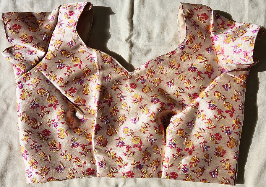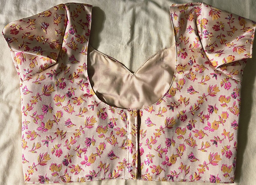 Cream saree blouse with pink and yellow printed design. Back opening; capped sleeves.