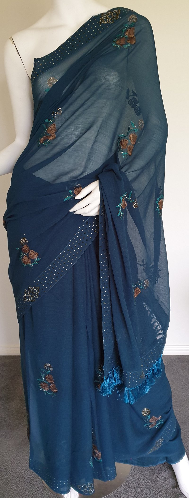 Deep Teal georgette saree with embroidery work. Completed with stonework border.