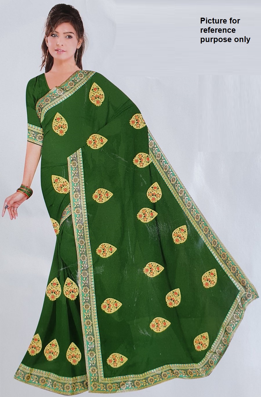 Green georgette saree with gold embroidery work. Completed with a gold embroidered border.
