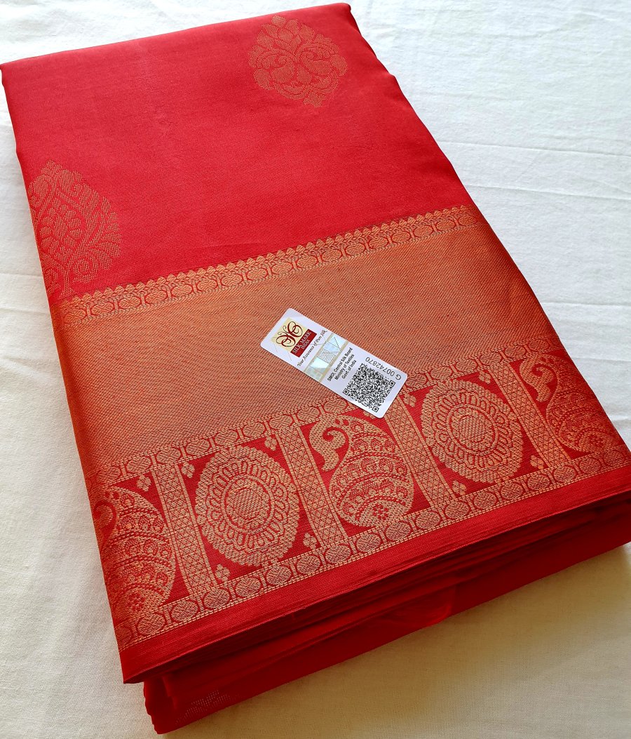 The saree comes with the Silk Mark tag to ensure its authenticity.  The fabric also has been flame tested for quality assurance that it is made of actual Kanchipuram pure silk.