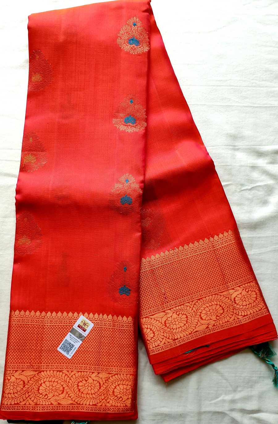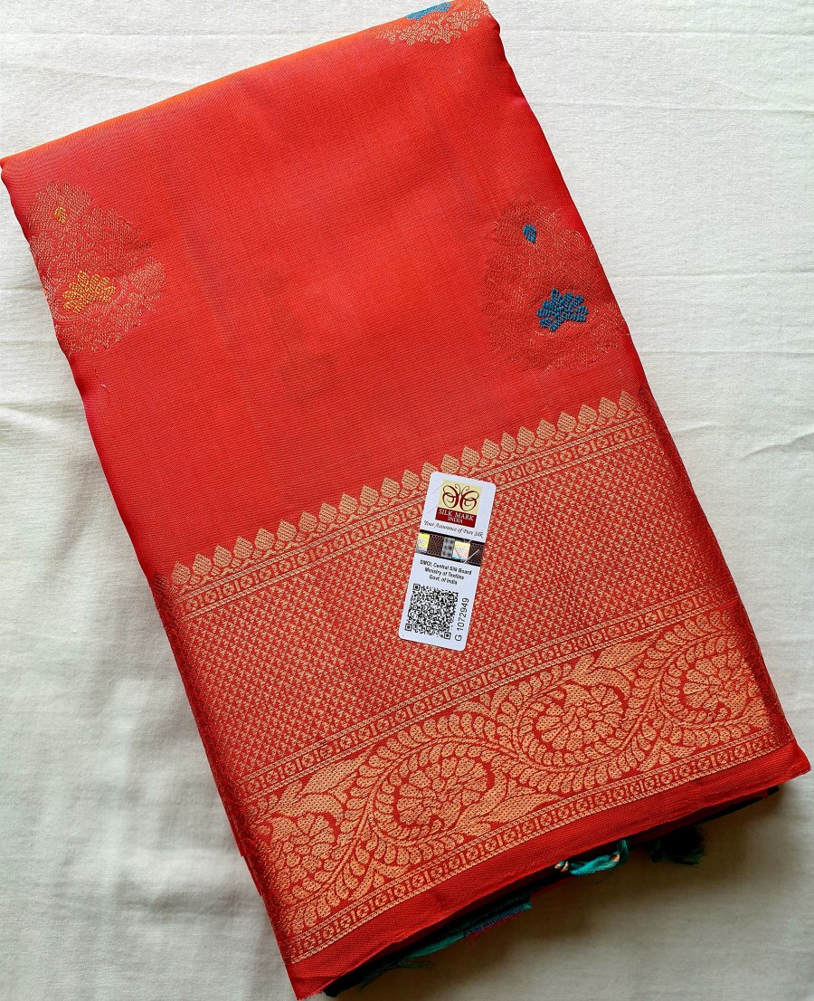 The saree comes with the Silk Mark tag to ensure its authenticity. The fabric also has been flame tested for quality assurance that it is made of actual Kanchipuram pure silk.